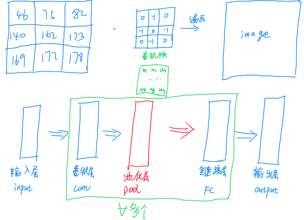 CNN卷积网络其实是对线性神经元的一个变体,可以想象把CNN拉直之后,就是线性的神经元操作,只不过我们把系数放到了一个矩阵里,依次对大矩阵内的输入值做点积,并把结果放到输出矩阵。被操作的部分数据称之为感受野,遍历过程称之为感受野平移,进行卷积的小矩阵称之为卷积核。CNN网络的训练其实就是通过训练找到所需的卷积核,需要注意的是,一些操作的卷积核是已知的,例如在ps中进行图像浮雕化操作等。