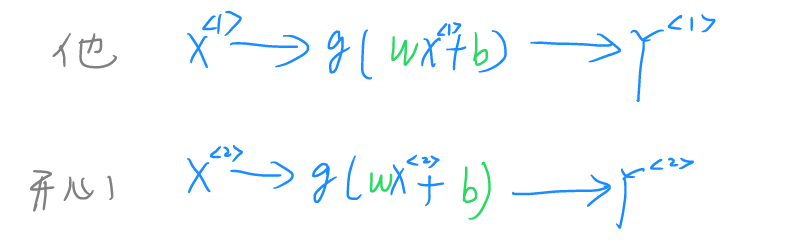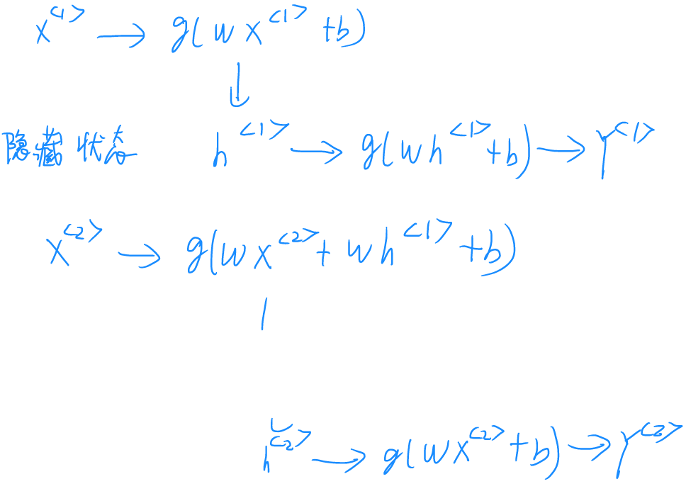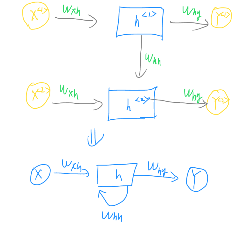 为了解决这个问题,采用如上图所示的技术,第一个词的神经网络并不直接输出结果,而是转而输出一个隐藏的中间层h1,在第二个词处理时,加入一项含有h1的权重,然后再输出第二个隐藏中间层h2……如此便可在后续词处理过程中引入前项词的信息,完成信息的流通,避免两个词之间无依赖的问题。