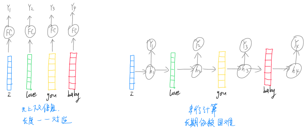 至此,完成了RNN循环网络的原理说明。然而RNN循环网络存在一些问题,例如无法捕捉长期依赖以及只能穿行计算,无法进行并行计算效率较低。针对这些缺陷,学者们进行了一些改进,例如使用LSTM遗忘门,使得RNN循环网络选择性的保留或遗忘所需前项词的信息,能够保留更多长期依赖等,但结构比较复杂,且终归无法解决穿行计算的问题,因此,亟需有一种全新的架构来简化与加快计算。
