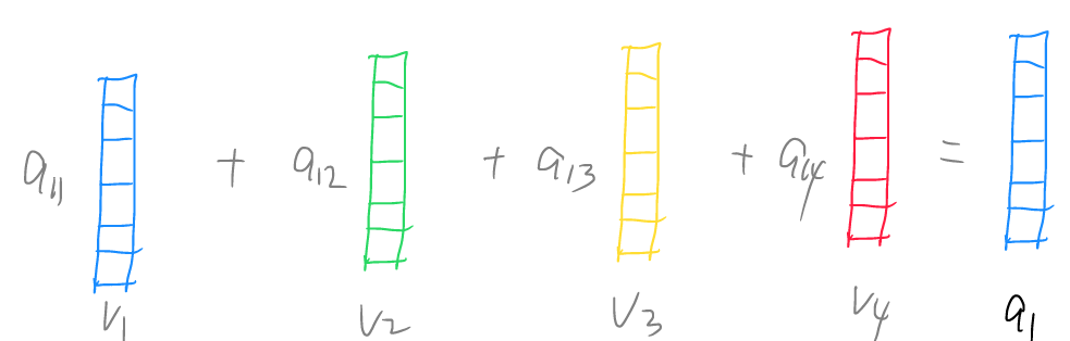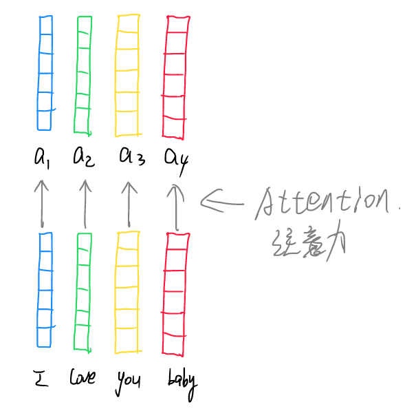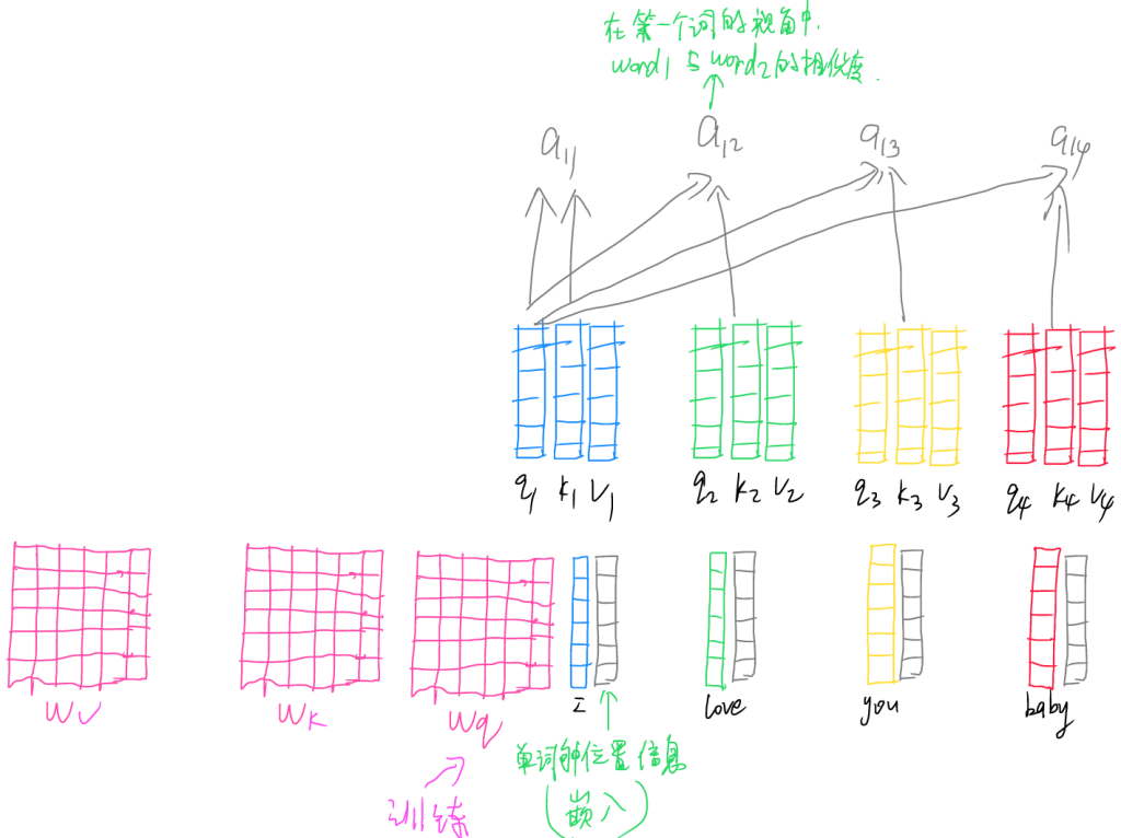 然后再分别和v1,v2……做运算,求和后就得到了包含全部语义信息的第一个词向量 a1。