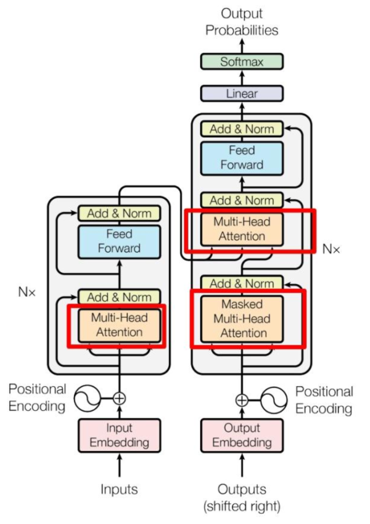 明白了多头注意力机制之后再来看这副世界名画,则层次分明,逻辑简单。输入的词向量首先经过词嵌入技术,输入编码器,编码器内进行多头注意力处理,然后经过feed forward全连接和残差连接、归一化等操作,输入解码器的多头注意力部分作为Q和K矩阵。解码器同样具有词嵌入,前置多头注意力机制,残差连接、归一化等操作,然后作为V矩阵,与含有解码器输出的Q和K矩阵一同进行多头注意力操作,随后经过feed forward全连接和残差连接、归一化,最后经过线性操作后外套softmax激活函数输出预测单词。掌握了基本的CNN,RNN,Transformer等等框架的基本原理后,可以在不同的模型中嵌套,训练,最终得到千变万化的实现不同功能的大模型,大模型在论文”Attention is all your need .”后得到了充足的发展。