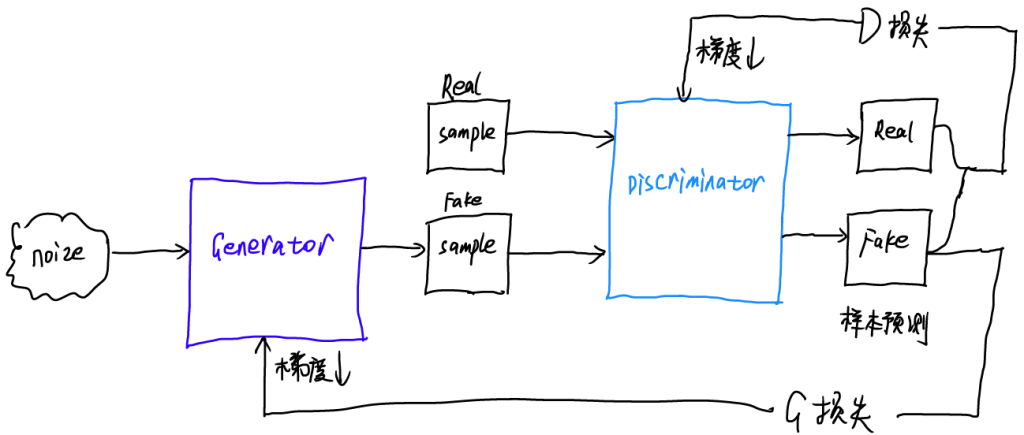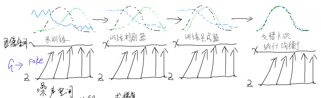 训练的过程如上图所示,由噪声空间输入噪声入图像空间,然后生成器生成假图像。训练首先在判别器上进行,在未经训练时,判别器对于生成器生成图像的真实性判断不佳,存在较大的误差,训练k次判别器后,在真实图像一侧给出高分,在生成图像一侧给出低分。随后进行一次生成器的训练,将生成图像数据分布往真实图像一侧靠近。交替训练数轮之后,二者达到纳什均衡。