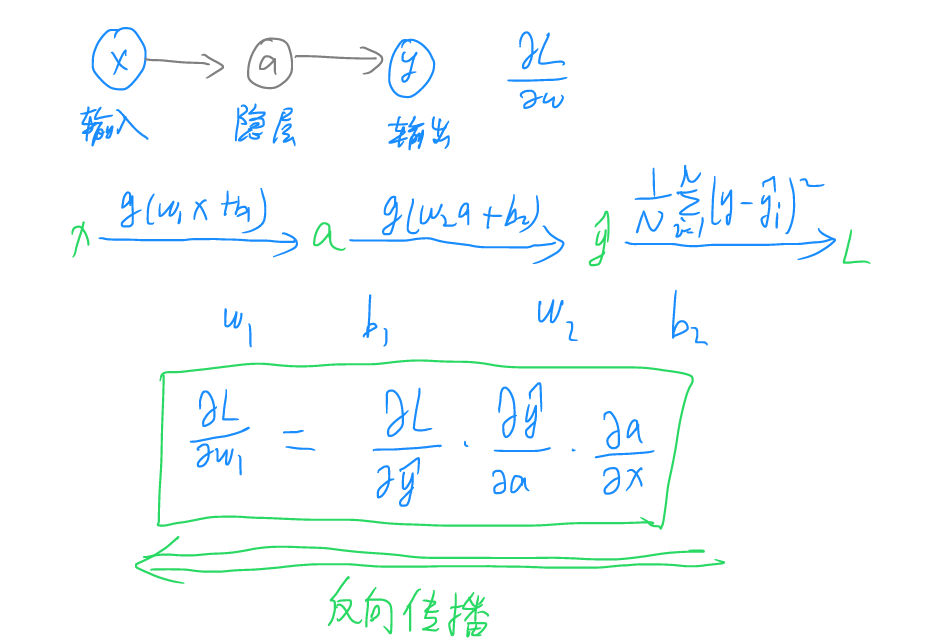 从输入至输出经过了多轮求偏导的操作,由于求偏导的过程可逆,此处可一步步反推从输入层至隐层至输出层和损失函数之间的参数,这个反推的过程称之为反向传播。