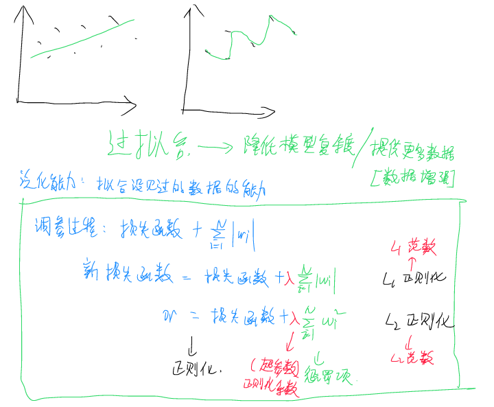 过拟合,是指模型在处理已有数据时表现优异,但处理未见过的数据时表现不佳的概念。如上图所示,其主要原因为模型复杂度过高,泛化性不足。为了避免过拟合的问题,通常我们需要进行数据增强(即提供更多数据),或者采用降低模型复杂度的方法,前者通常比较棘手,因为优质数据获取不易,而后者有时可以简单粗暴,例如提前终止训练或者使用一些正则化的手段。